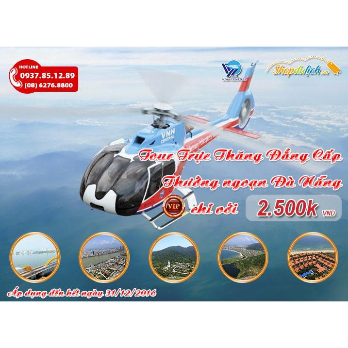 Trực thăng xuất phát từ Sân bay Nước Mặn Đà Nẵng đưa quý khách bay vòng lên ngắm Ngũ Hành Sơn từ trên cao. Sau đó, trực thăng lượn vòng lại bay đến Cầu Rồng, một cây cầu nổi tiếng với thiết kế độc đáo ở Đà Nẵng, tiếp tục bay dọc Sông Hàn để quý khách ngắm nhìn Cầu Sông Hàn, Cầu Thuận Phước cùng các khối kiến trúc cao tầng ấn tượng của thành phố. Đến Bán đảo Sơn Trà trực thăng lượn vòng ra biển để quý khách có thể ngắm nhìn vẻ đẹp hoang sơ của bán đảo Sơn Trà, chiêm ngưỡng tượng Phật Bà Quan Âm lớn nhất Việt Nam. Trực thăng đưa quý khách vòng lại bay dọc bãi biển Đà Nẵng về lại Sân bay Nước Mặn, kết thúc Tour Trực Thăng trải nghiệm.